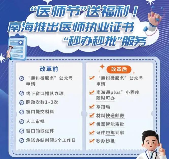 8月15日,南海区举办2024年医师节大会。会上,南海上线发布医师执业证书“秒办秒批”服务,即日起,南海医生们办理跨省增加执业机构、变更执业地点、变更主执业机构、补办、注销执业证书等5项业务,无需再到线下办事大厅提交材料,只需通过“民科微服务”公众号和“佛山南海通plus”小程序在线办理即可,并享受结果秒出、证件包邮到家的贴心服务。