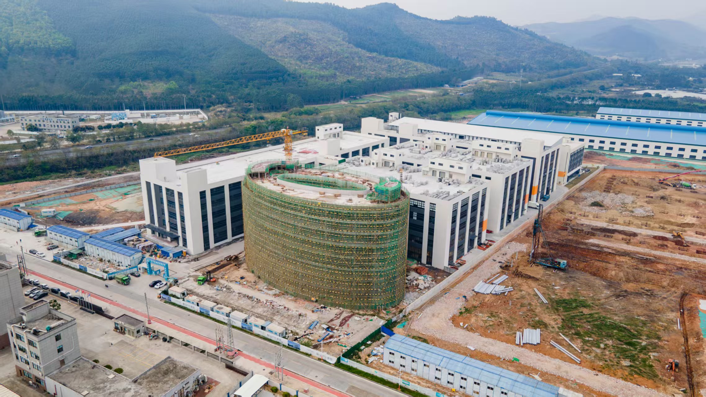 该项目于2024年入选广东省重点项目清单,目前仅剩办公大楼处于幕墙安装阶段,正加紧时间建设,力争在2026年2月农历新年前完成验收交付,其余建筑均已建设完毕,即将全面投入使用。