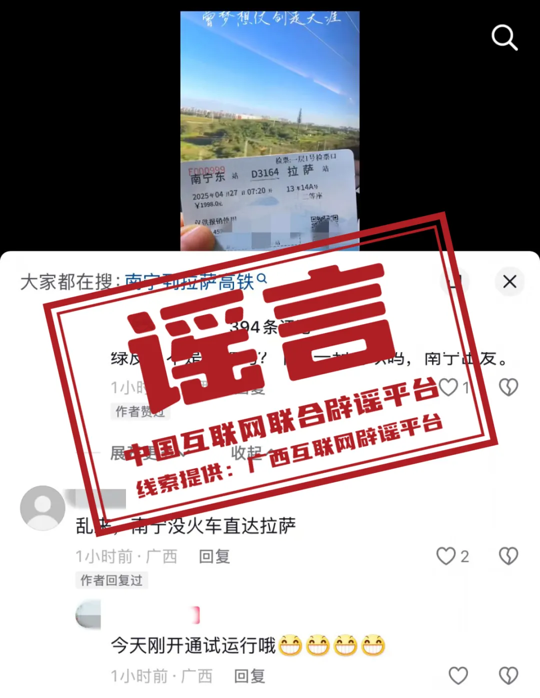 详情:近日,有网友在社交平台晒出一张“D3164”次动车组列车的“车票”,称乘坐该列车“可从南宁直达拉萨”,并在评论区回应称“这是‘今天(27日)刚开通试运行’的列车”,引发关注。经核查,网传信息不实。记者在中国铁路12306官网中搜索车次D3164,显示列车时刻表中无该次列车的信息,官网中也找不到从广西南宁直达西藏拉萨的列车。国铁南宁局相关工作人员明确表示,目前南宁暂无直达拉萨的火车,网民晒出的是不实信息。(来源:“广西互联网违法和不良信息举报”微信公众号、南国早报)