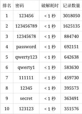 全球范围内,“123456”位列榜首,共有3018050个账户使用此密码,攻击者可在1秒内破解。其他常见弱密码包括“123456789”“12345678”“111111”等,破解耗时均不到1秒。