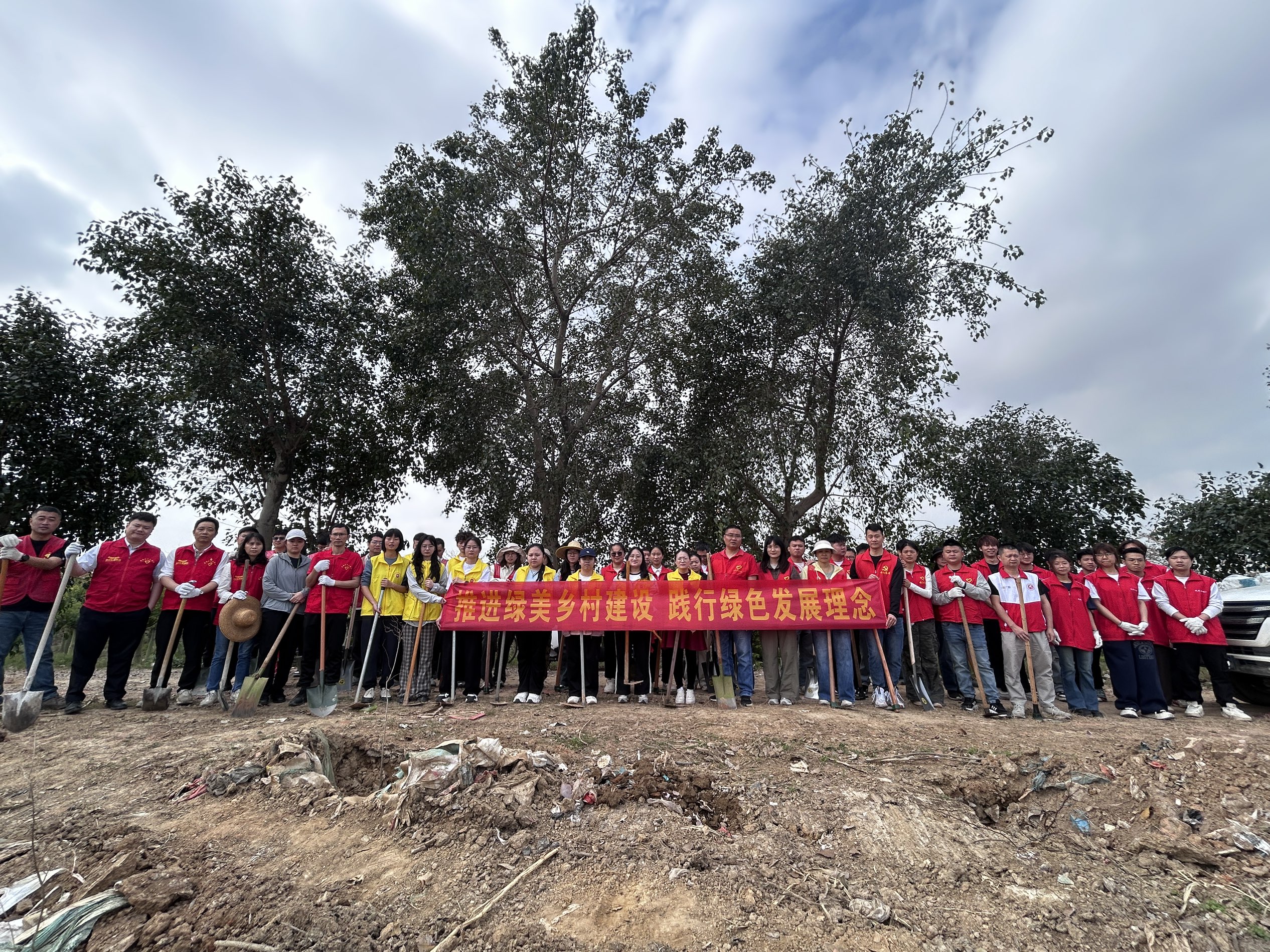 活动现场秩序井然、氛围热烈。志愿者们身着红色志愿马甲,分工清晰、配合默契。大家挥锹铲土、扶苗定植、填土夯实、围堰浇水,每一道工序都认真细致、有条不紊,力求栽一棵、活一棵。众人齐心协力、干劲十足,现场呈现出一派热火朝天的劳动场景。鲜艳的 “志愿红” 与盎然的 “生态绿” 在春日里交相辉映,绘就出一幅生机盎然的乡村植绿画卷。