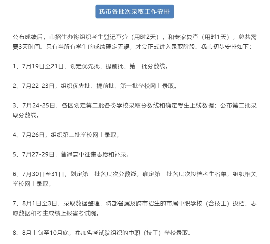 7月15日,佛山市教育局、佛山市招生办相关负责人在上线《民生直通车》栏目时对于考生和家长这一问题进行正式回应,称我市将于7月16日15:00起公布初三中考成绩,并于7月19日起陆续划定各批次录取分数线以及进行相关录取安排。