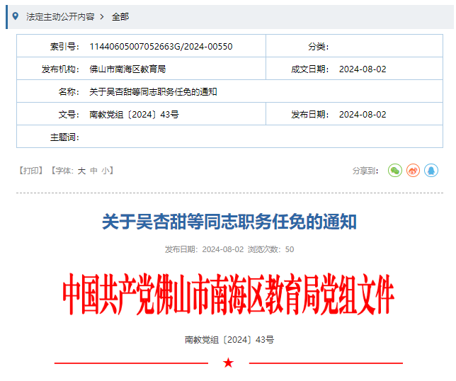 8月2日,佛山市南海区教育局发布《关于吴杏甜等同志职务任免的通知》,事关大沥镇多所公办中小学校。各位街坊注意!
