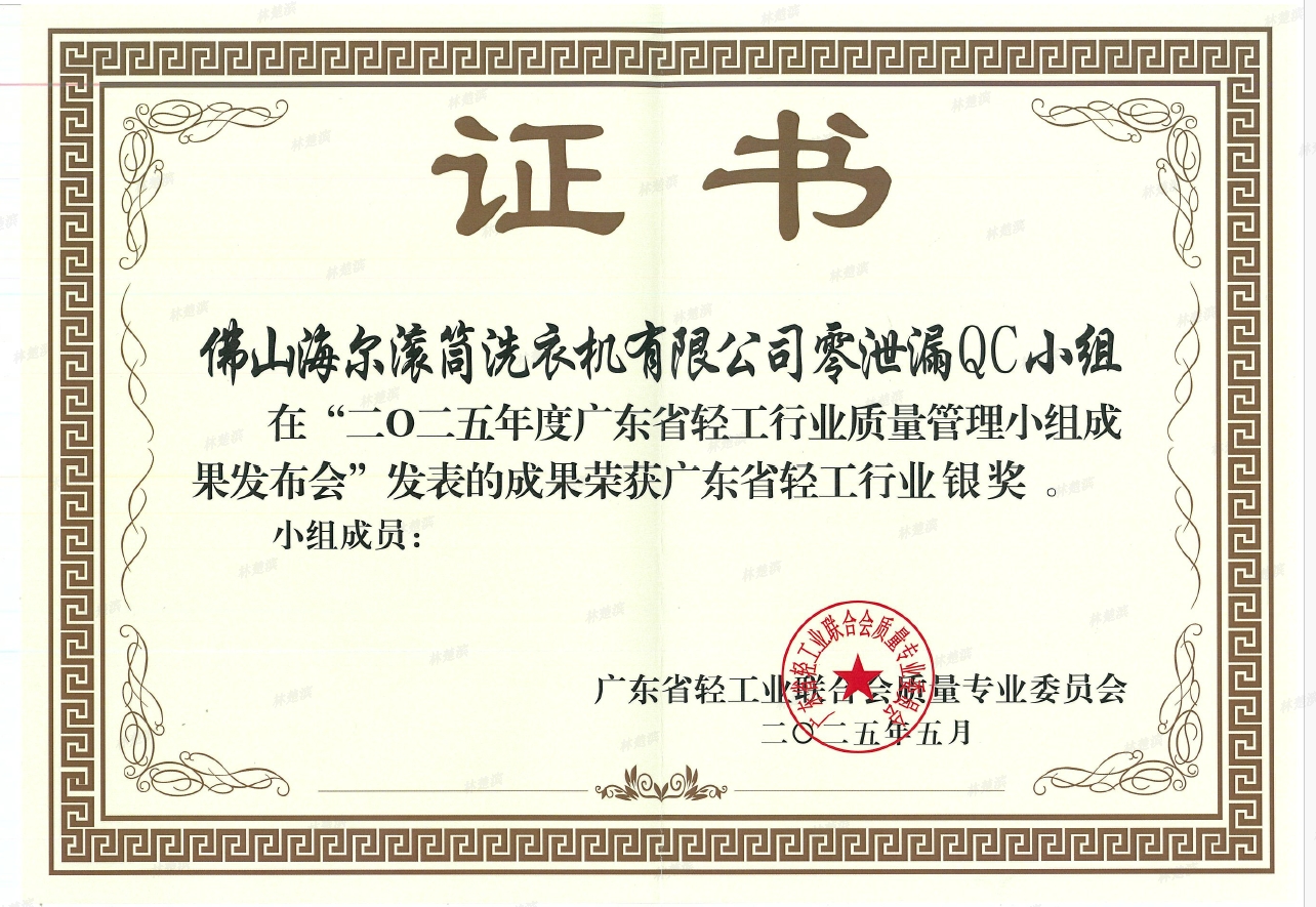 在广东省轻工业联合会主办的2025年度广东省轻工业质量管理小组活动成果发布会上。佛山海尔滚筒洗衣机有限公司100%平QC小组及佛山海尔滚筒洗衣机有限公司零泄漏QC小组以优异的表现和实力,获得广东省轻工行业银奖。