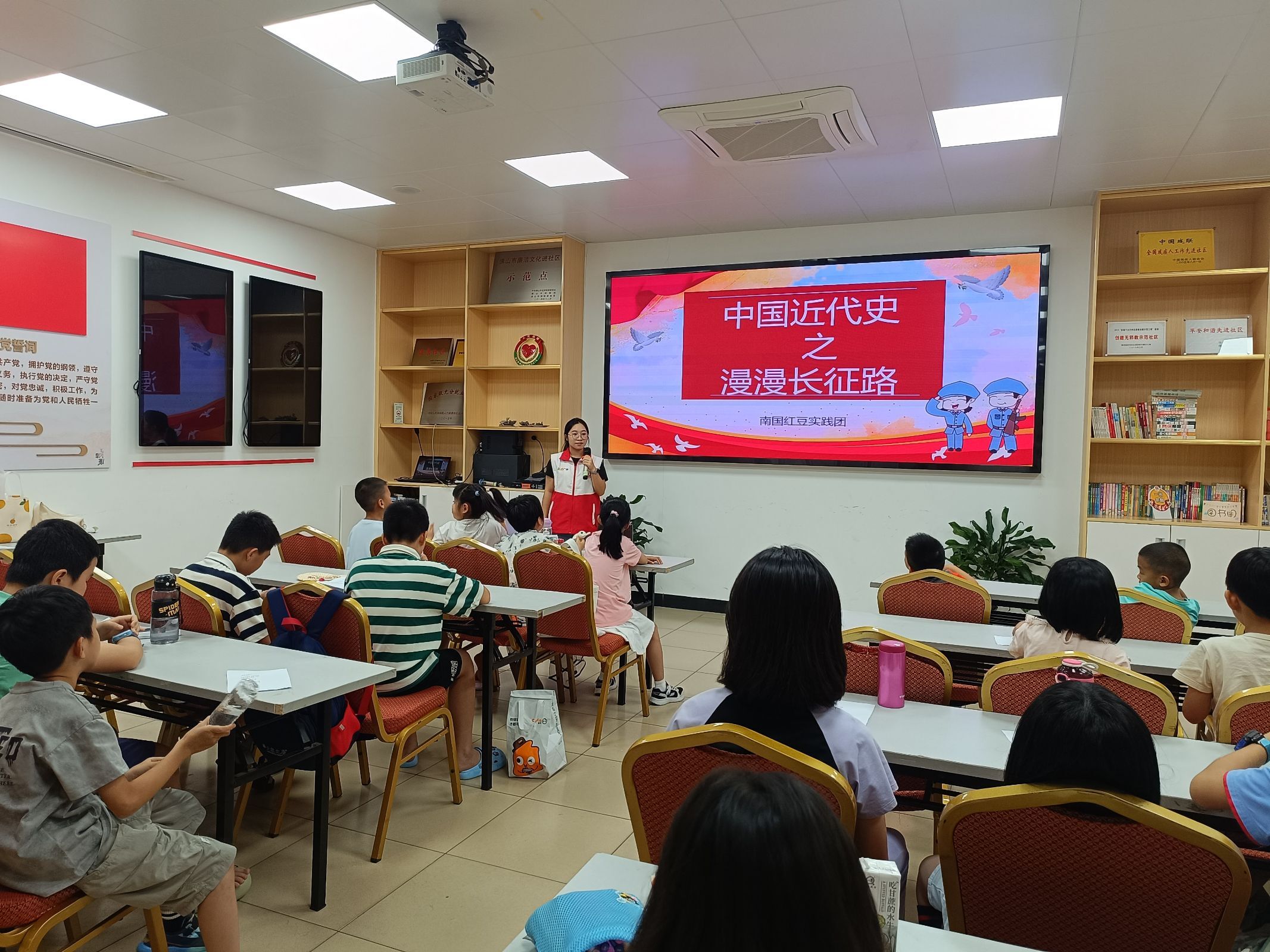 佛山大学南国红豆实践团于今年7月前往佛山市禅城区塔坡社区弘扬红色长征文化。义教老师通过图片讲解给小朋友介绍了什么是红军,什么是长征,使孩子们对红军长征的故事有一个大概的印象。紧接着,义教老师给孩子们讲述《长征路上红小丫》这个绘本故事,并在其中穿插一些游戏和提问环节,使孩子们体会长征路上的艰难,对红军产生敬佩之情。课后,老师还和小朋友们一起完成了绘本故事的作品设计。