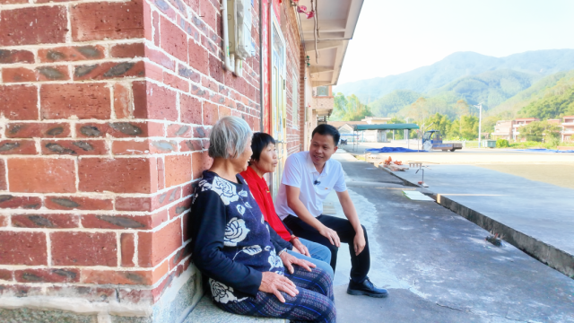 ▲白洞村党委书记李贤斌和村民交流